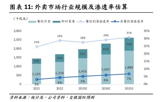 即时零售的市场就更广阔了。据交银国际去年年初的报告。预计2025年,即时零售的市场规模为7400亿元,渗透率仅7%。