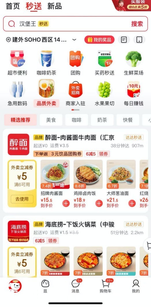 事实上,京东一只脚踏进了外卖领域,另一脚也迈入了美团另一核心业务——到店和到综业务。今年1月,京东App秒送专区上线团购频道,用户可在其中购买瑞幸、库迪、霸王茶姬,汉堡王、达美乐等知名茶咖和餐饮品牌的优惠券,再到店核销。